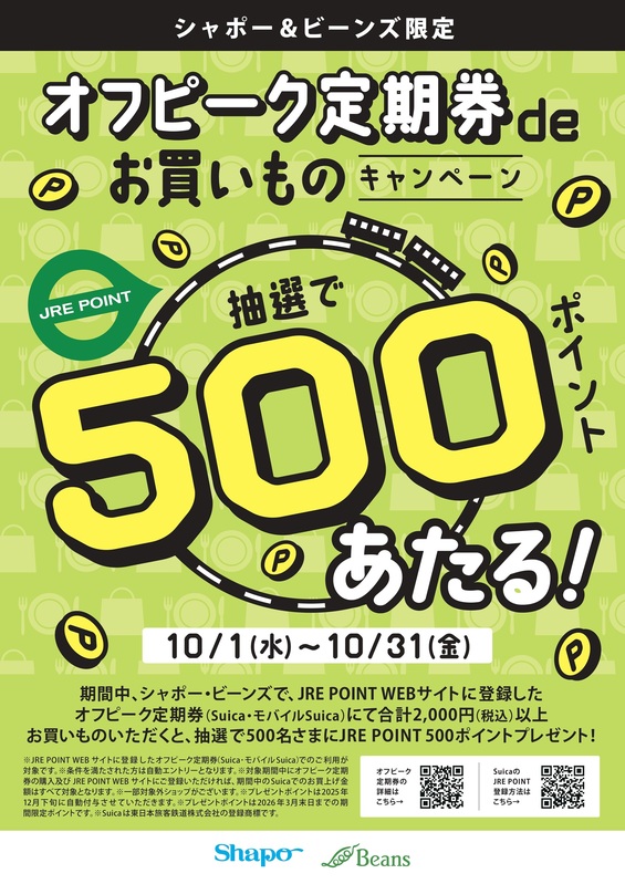 期間中、シャポー・ビーンズでJRE POINT WEBサイトに登録したオフピーク定期券(Suica・モバイルSuica)にて合計2,000円(税込)以上お買いものいただくと、抽選で500名さまにJRE POINT500ポイントプレゼントキャンペーンを実施中です。