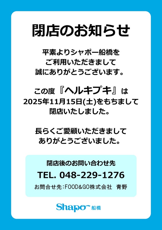 閉店のお知らせ|トピックス|シャポー船橋 | JR総武線船橋駅直結のショッピングセンター