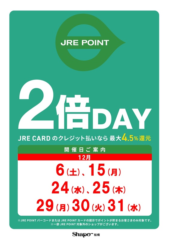 トピックス 12月の2倍デー 12月の2倍デーは下記の開催です!【6日(土)・15日(月)・24日(水)・25日(木)・29日(月)・30日(火)・31日(水)】お得なこの機会に、ぜひシャポー船橋にお越しくださいませ♬ tweetする Facebookでシェアする LINEで送る