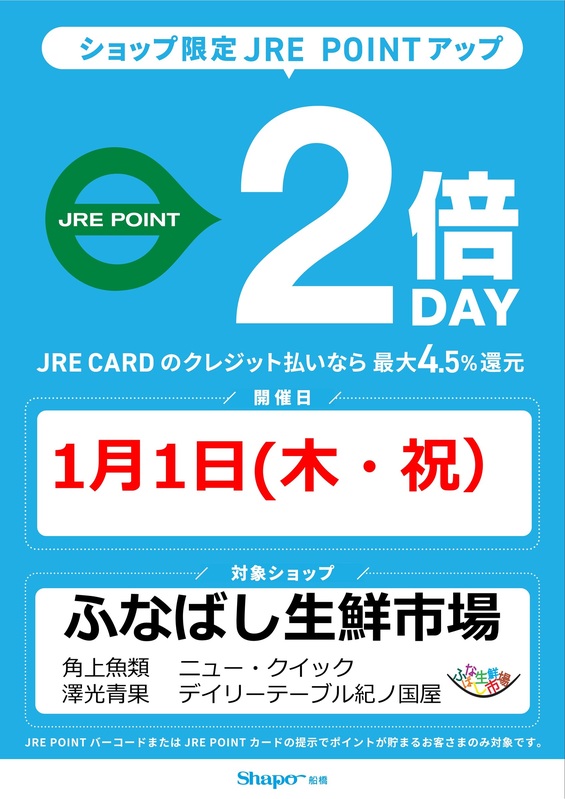 トピックス 1月1日はふなばし生鮮市場限定 JRE POINT 2倍デーです! ご来店お待ちしております。※営業時間は9時~17時となります tweetする Facebookでシェアする LINEで送る