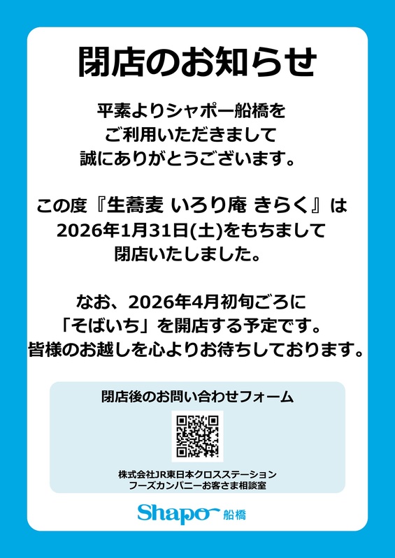 トピックス 閉店のお知らせ 1月31日(土)をもちまして、改札内ショップ『生蕎麦 いろり庵 きらく』は閉店いたしました。 なお、2026年4月初旬ごろに「そばいち」を開店する予定です。皆さまのお越しを心よりお待ちしております tweetする Facebookでシェアする LINEで送る