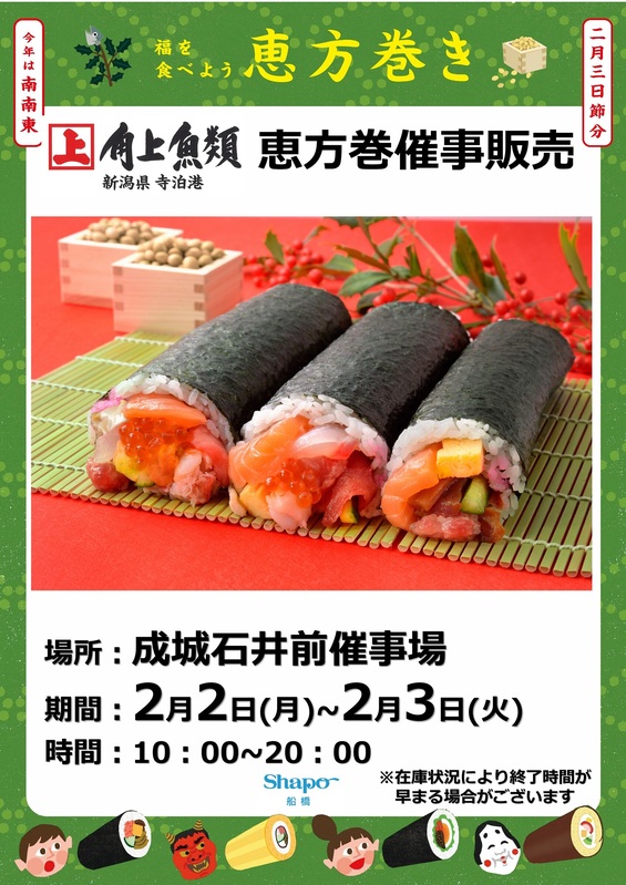 トピックス 角上魚類 恵方巻催事販売を行います! 角上魚類が恵方巻催事販売を実施します!場所:成城石井前催事場期間:2月2日(月)~3日(火)時間:10:00~20:00※在庫状況により終了時間が早まる場合がございます tweetする Facebookでシェアする LINEで送る