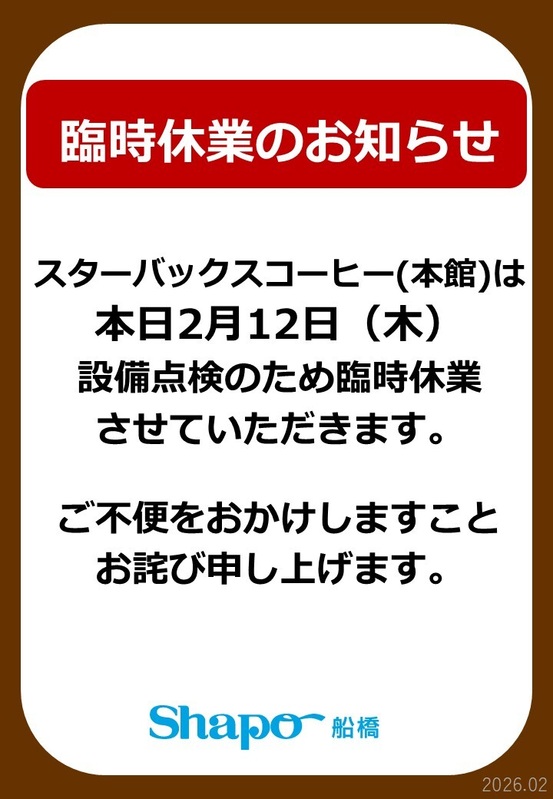 トピックス スターバックスコーヒー(本館)臨時休業のお知らせ いつもシャポー船橋をご利用いただきありがとうございます。スターバックスコーヒー(本館)は本日2月12日(木)設備点検のため臨時休業とさせていただきます。ご不便おかけしますことお詫び申し上げます。 tweetする Facebookでシェアする LINEで送る