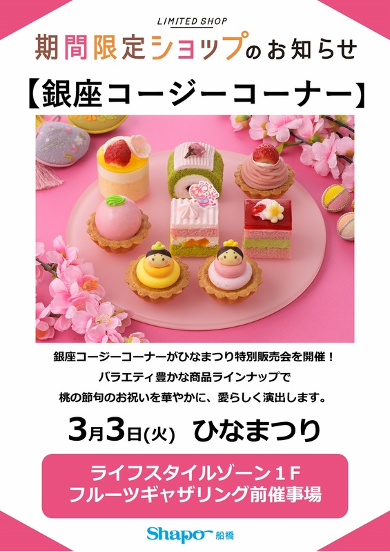 トピックス 銀座コージーコーナー ひなまつり特別販売会 3月3日(火)はひなまつり🎎ライフスタイルゾーン1Fフルーツギャザリング前催事場にて銀座コージーコーナーがひなまつり特別販売会を行います🌸種類豊富なケーキをご用意してお待ちしております! tweetする Facebookでシェアする LINEで送る