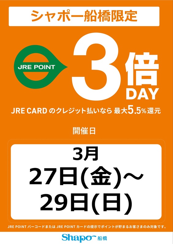 トピックス 3月は2倍デーに代わり3倍デー! 3月はお客さまへ日頃の感謝を込めて2倍デーに代わり特別に3倍デーを実施いたします!実施期間【27日(金)~29日(日)】お得なこの機会に、ぜひシャポー船橋にお越しくださいませ♬ tweetする Facebookでシェアする LINEで送る