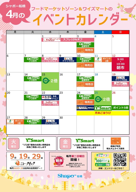トピックス 4月イベントカレンダー いつもシャポー船橋をご利用いただき、誠にありがとうございます。ふなばし生鮮市場をはじめ、フードマーケットゾーンやワイズマートのおトクな情報をご紹介いたします。ぜひこの機会にお立ち寄りくださいませ。 tweetする Facebookでシェアする LINEで送る