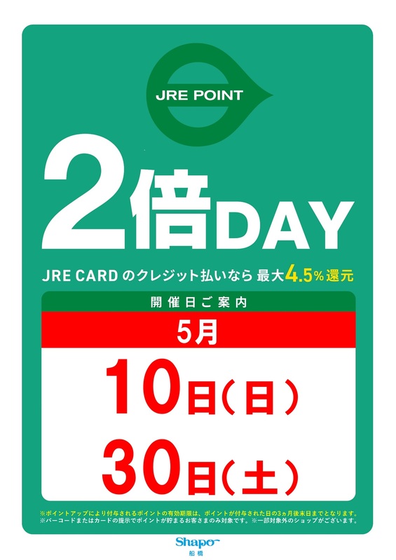 トピックス 5月2倍デーのお知らせ 5月の2倍デーは下記の開催です!【10日(日)、30日(土)】お得なこの機会に、ぜひシャポー船橋にお越しくださいませ♬ tweetする Facebookでシェアする LINEで送る
