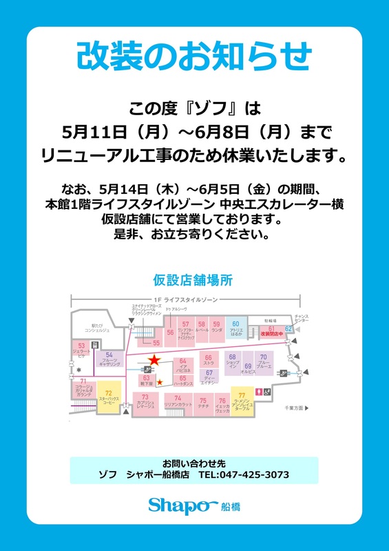 この度「ゾフ」は5月11日(月)~6月8日(月)までリニューアル工事のため休業いたします。