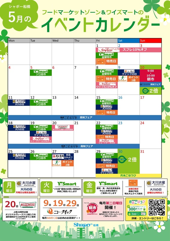 トピックス 5月のイベントカレンダー いつもシャポー船橋をご利用いただき、誠にありがとうございます。ふなばし生鮮市場をはじめ、フードマーケットゾーンやワイズマートのおトクな情報をご紹介いたします。ぜひこの機会にお立ち寄りくださいませ。 tweetする Facebookでシェアする LINEで送る