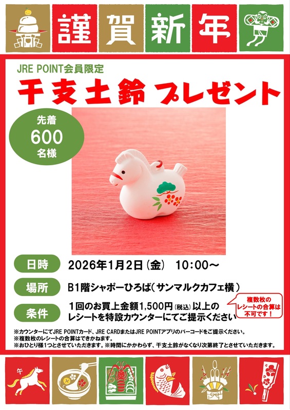 レシートをご提示の先着600名様に干支土鈴をプレゼントいたします。
