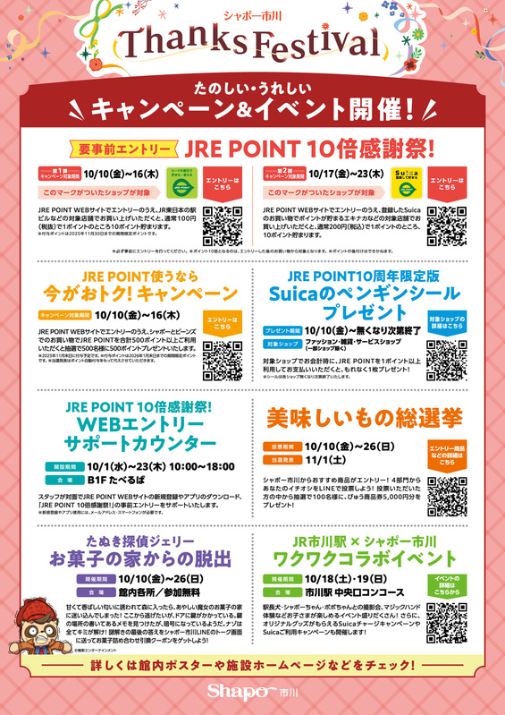 トピックス シャポー市川 サンクスフェスティバル 開催! ✨イベント・キャンペーンの一覧をご紹介✨ <備考・注意事項> ※各キャンペーンの詳細はそれぞれのトピックスページをご参照ください。 tweetする Facebookでシェアする LINEで送る