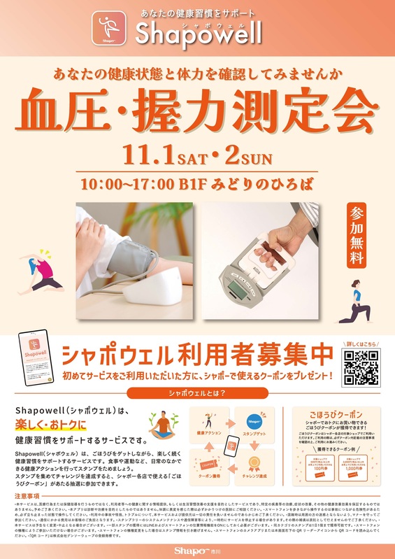 トピックス 11月1日・2日「血圧・握力測定会」開催します 血圧や握力を測定し、自身の健康状態をチェックしよう!健康習慣化サービス「シャポウェル」に登録すれば、お得なクーポンをゲットできます。 場所 みどりのひろば 「シャポウェル」についてはコチラ tweetする Facebookでシェアする LINEで送る
