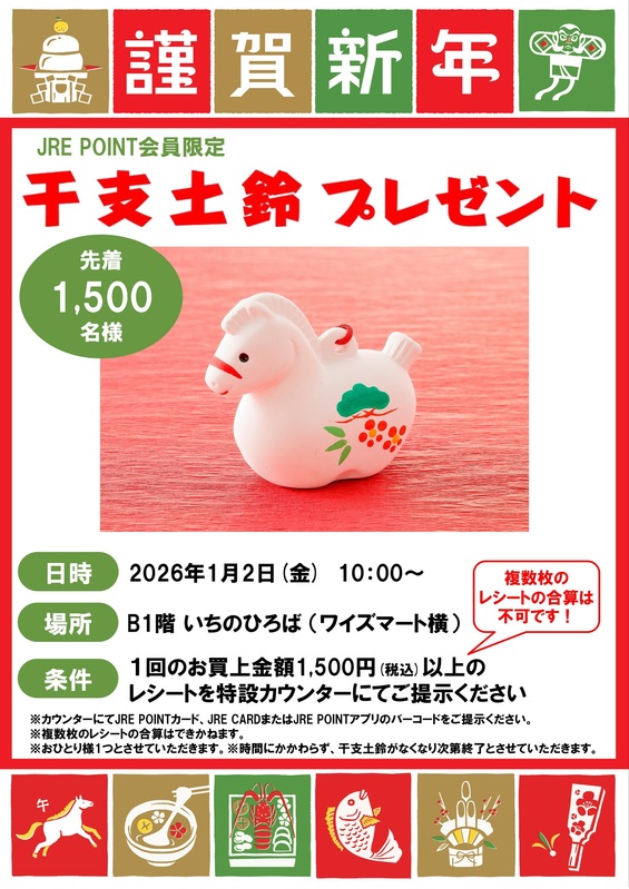 ※複数枚のレシートの合算はできかねます。 ※おひとり様1つとさせていただきます。 ※時間にかかわらず、干支土鈴がなくなり次第終了とさせていただきます。