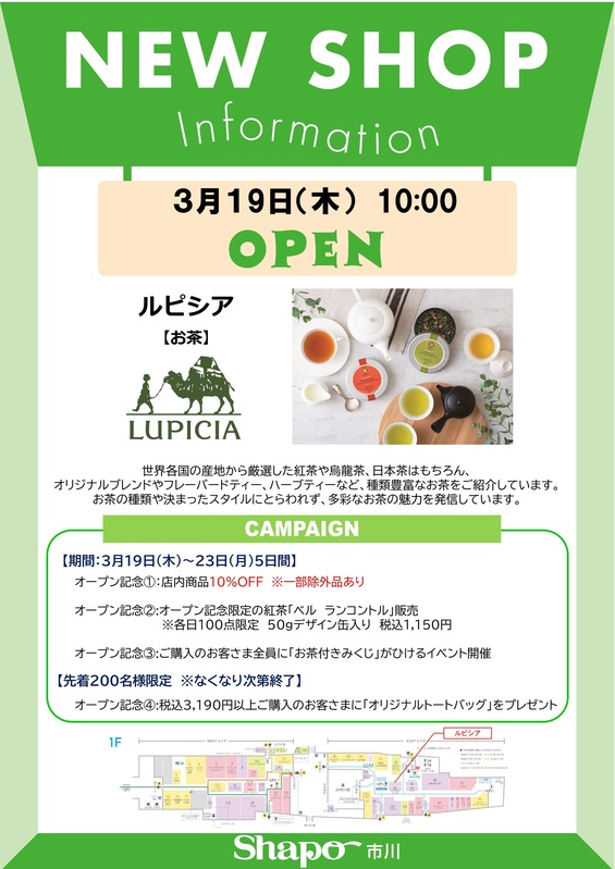 【3/19】ルピシアがシャポー市川にオープン!