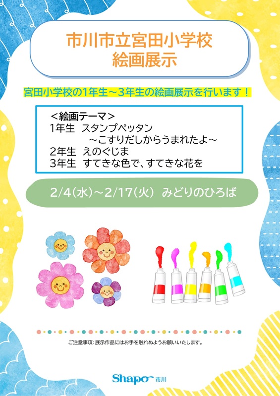 トピックス 宮田小学校 絵画展示 市川市立宮田小学校1年生~3年生の絵画展示を行います!日程:2/4(水)~2/17(火)場所:シャポー市川 みどりのひろば(千葉側入口) tweetする Facebookでシェアする LINEで送る