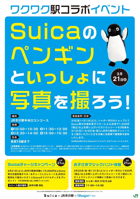 トピックス Suicaのペンギンといっしょに写真を撮ろう! 3月21日(土)に、Suicaのペンギンとの写真撮影会を開催します🎉Suicaチャージキャンペーンとお子さまマジックハンド体験も同時開催!参加条件などの詳細は上記ポスター画像をご確認ください。 tweetする Facebookでシェアする LINEで送る