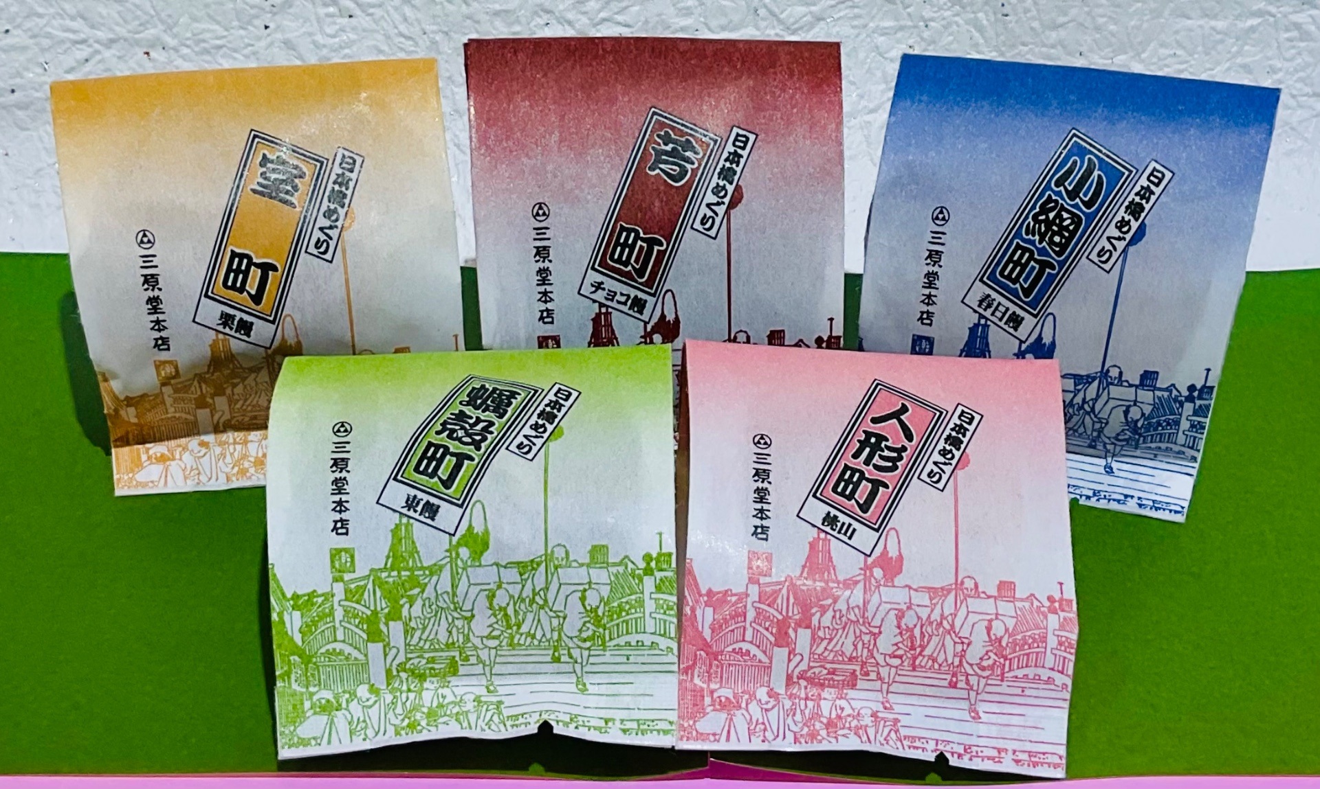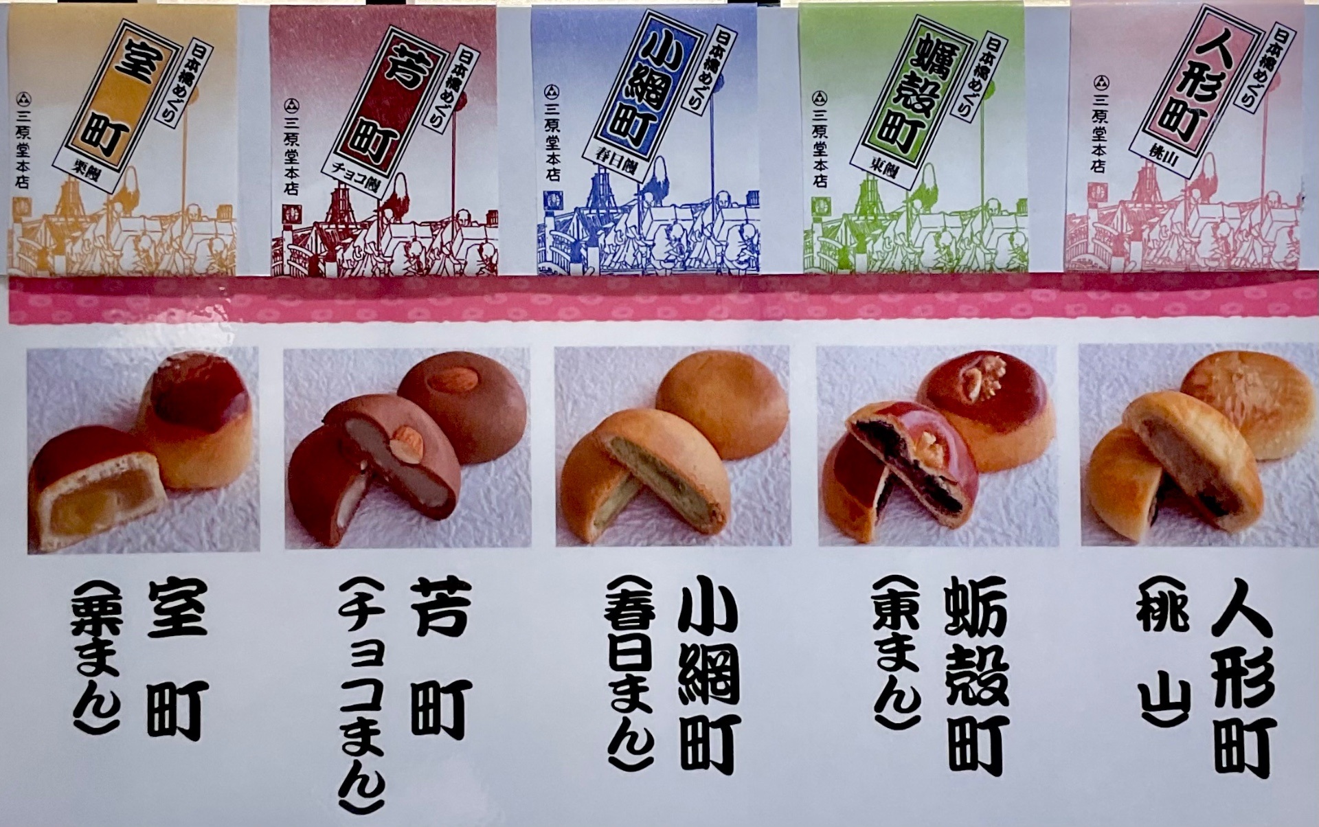 日本橋めぐり 5種類のおまんじゅうです 黄色の袋は 栗まんじゅう 赤色の袋は 洋風チョコまんじゅう アーモンド入り 青色の袋は 抹茶まんじゅう 緑色の袋は つぶあん くるみ入り ピンク色の袋は 黄身あん ラムレーズン入り