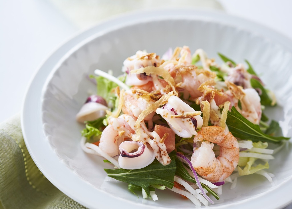ぷりぷりの海老や甘海老、イカ、サーモンなど海の幸がたっぷり。トビコ入りソースが旨みを引き立て、食感も楽しい、特別感のあるサラダです。特別な日にも、日常のちょっとしたごちそうにもおすすめの一品です。