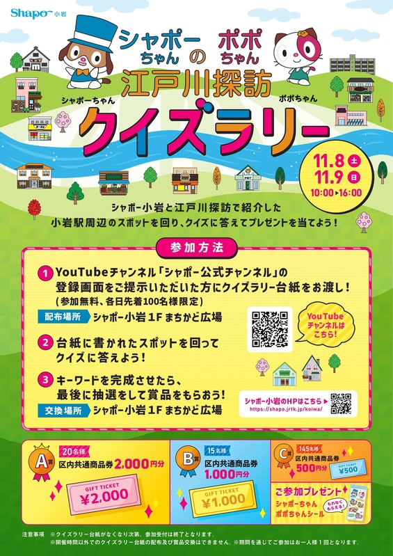 トピックス シャポーちゃんポポちゃん江戸川探訪のクイズラリー シャポー小岩と江戸川探訪で紹介した小岩駅周辺のスポットを回り、クイズに答えてプレゼントを当てよう! tweetする Facebookでシェアする LINEで送る
