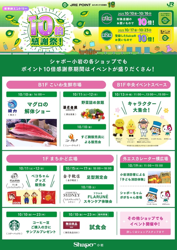 トピックス JRE POINT10倍 シャポー小岩情報! シャポー小岩ではJRE POINT10倍の期間、小岩ならではのイベントをいろいろ実施しております。是非お立ち寄りください! 各ショップの情報はコチラ tweetする Facebookでシェアする LINEで送る