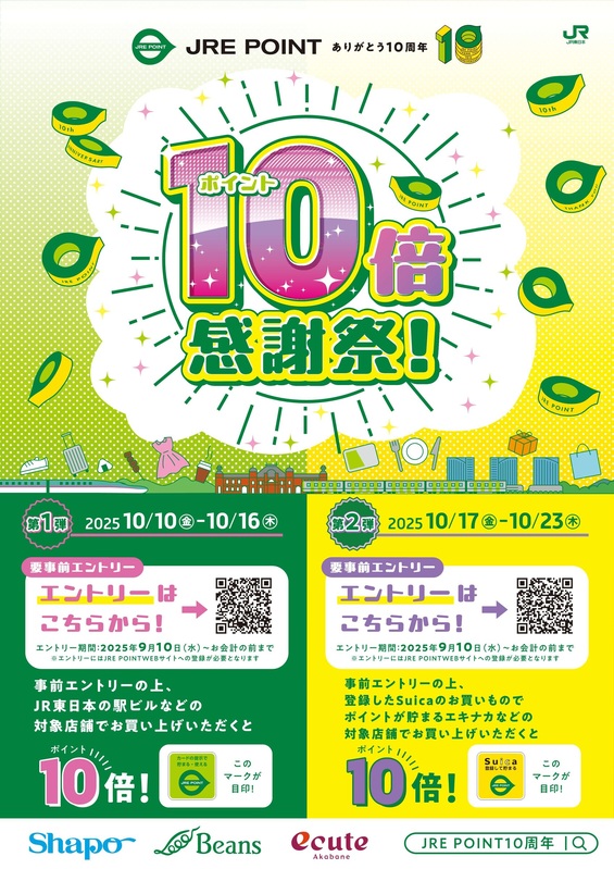 これを記念して、10月10日(金)~10月16日(木)JR東日本の駅ビルではJRE POINT10倍キャンペーンを開催いたします!