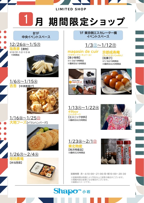 1月の期間限定ショップ|トピックス|シャポー小岩 | JR総武線小岩駅直結のショッピングセンター