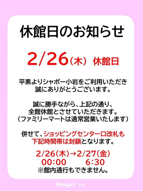 誠に勝手ながら、2/26(木)は全館休館とさせていただきます。
