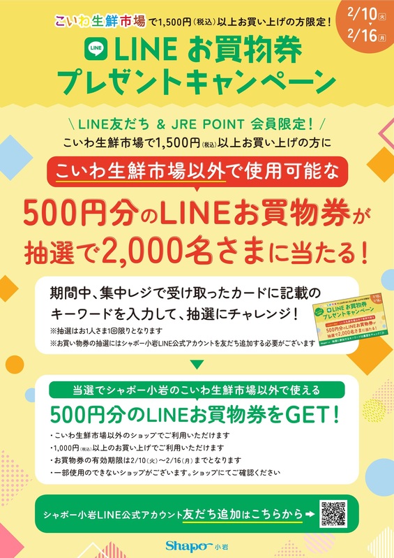 こいわ生鮮市場以外で使用可能な500円分のLINEお買物券が抽選で2,000名さまに当たる!