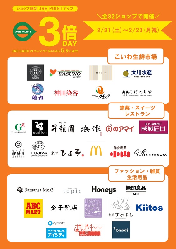 【予告】全32ショップでJRE POINT3倍デー開催!|トピックス|シャポー小岩 | JR総武線小岩駅直結のショッピングセンター