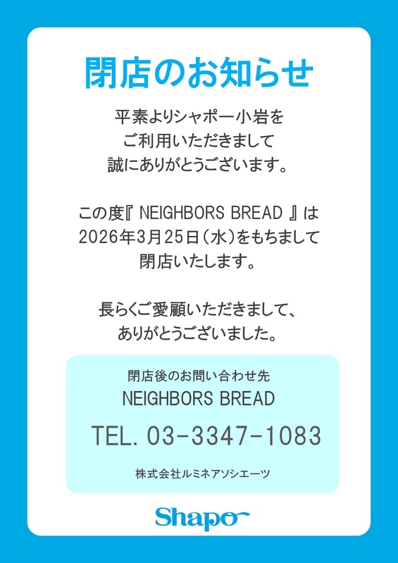 NEIGHBORS BREAD(ネイバーズ ブレッド) 閉店のお知らせ|トピックス|シャポー小岩 | JR総武線小岩駅直結のショッピングセンター