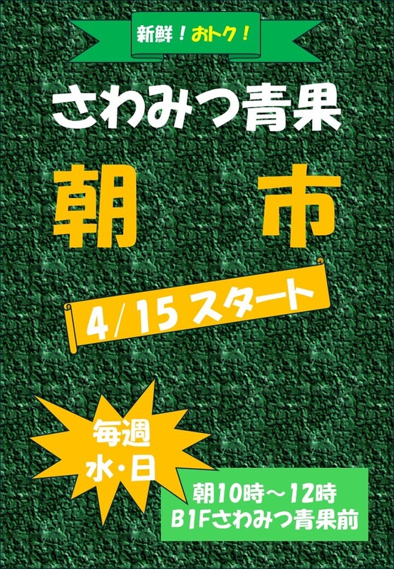 トピックス さわみつ青果 朝市スタート! 4月15日(水)スタート!毎週水曜・日曜は【さわみつ青果】の朝市開催♪ 開催日時 毎週水曜・日曜 10:00~12:00 場所 B1F さわみつ青果前 tweetする Facebookでシェアする LINEで送る