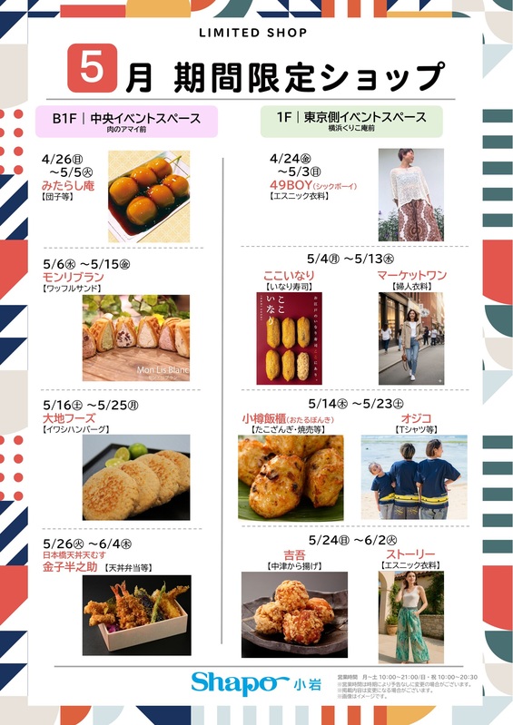5月 期間限定ショップ|トピックス|シャポー小岩 | JR総武線小岩駅直結のショッピングセンター