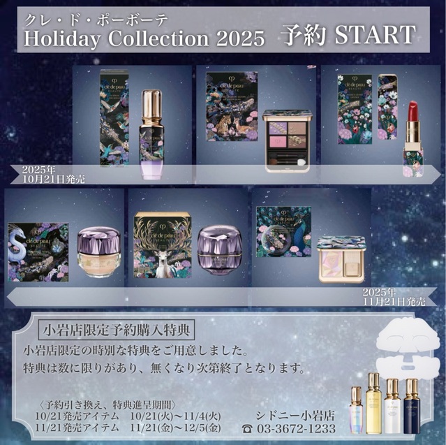 クレ・ド・ポー ボーテのホリデーコレクションが、2025年10月21日(火)、11月21日(金)より、それぞれ発売されます❣️ 2025年のホリデーは、人生を変える大きなチャンスや新たな冒険を象徴する列車にインスパイアされた「DREAMS EXPRESS(幻想的な列車の旅)」がテーマです☝🏻 是非、店頭に自信とときめきによる輝きを纏う体験をしにいらしてください。 また、当店限定で、2025年ホリデーコレクションをご予約のうえご購入いただいた方へ、特別な特典をご用意しました✨ 〈プレゼント内容〉 ☑️一品以上ご予約、ご購入で進呈‼️ ・クレ・ド・ポー ボーテ ル・セラムⅡ <美容液> 3日分 ・クレ・ド・ポー ボーテ ローションエサンシエルA <化粧水> 3日分 ・クレ・ド・ポー ボーテ エマルションプロテクトゥリス(ジュール) <乳液(日中用)> SPF25・PA+++ 3日分 ・クレ・ド・ポー ボーテ エマルションアンタンシヴ(ニュイ) <乳液(夜用)> 3日分 ☑️ホリデーコレクション一品以上含む、クレ・ド・ポーボーテ商品33,000円以上ご購入で進呈‼️ ・クレ・ド・ポー ボーテ マスクエクレルシサン<(医薬部外品)シート状美白マスク>1枚 ・クレ・ド・ポー ボーテ ル・セラムⅡ <美容液> 3日分 ・クレ・ド・ポー ボーテ ローションエサンシエルA <化粧水> 3日分 ・クレ・ド・ポー ボーテ エマルションプロテクトゥリス(ジュール) <乳液(日中用)> SPF25・PA+++ 3日分 ・クレ・ド・ポー ボーテ エマルションアンタンシヴ(ニュイ) <乳液(夜用)> 3日分 〈対象商品〉 10/21(火)発売 ・ル・セラム II HOLIDAY 2025〈美容液〉50mL 30,800円(税込) ・ルージュアレーブル527 HOLIDAY 2025〈口紅〉限定色7,150円(税込) ・オンブルクルールクアドリ504 HOLIDAY 2025〈アイシャドウ〉限定色10,340円(税込) 11/21(金)発売 ・ラ・クレーム HOLIDAY 2025(医薬部外品)〈クリーム〉30g 71,500円(税込) ・ル・レオスールデクラ110 HOLIDAY 2025〈フェイスカラー〉限定色 9,350円(税込) ・ル・フォンドウタンn HOLIDAY 2025 オークル00、オークル10〈ファンデーション〉30g 9,350円(税込) 〈予約商品引き換え、特典進呈期間〉 ・10/21発売アイテム 10/21(火)〜11/4(火) ・11/21発売アイテム 11/21(金)〜12/5(金)
