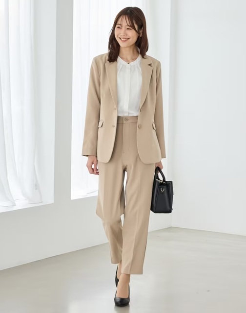 【ジャケット】ベーシックなテーラードカラーの2つボタンタイプ。スカートにもパンツにも合う丈感と程よくシェイプされたウエストラインのすっきり見えシルエット。税込4980円 【パンツ】センタープレス入りで美脚効果も抜群のテーパードパンツ。裾に向かってさりげなく細くなるすっきりとしたシルエット。税込3980円