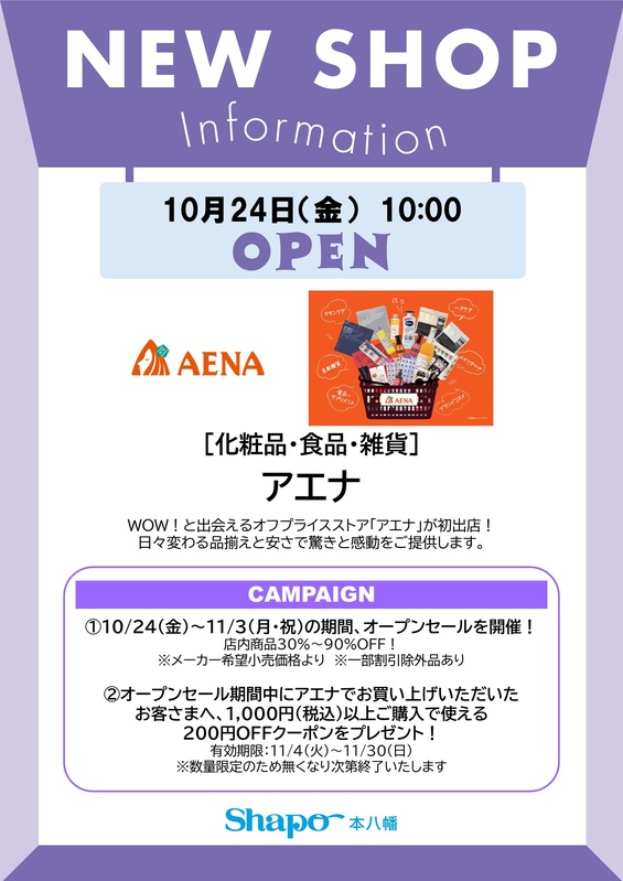トピックス 『アエナ』がオープン! WOW!と出会えるオフプライスストア「アエナ」が初出店! 日々変わる品揃えと安さで驚きと感動をご提供します。 開催日時 2025年10月24日 10:00オープン!! 場所 1階 アエナ tweetする Facebookでシェアする LINEで送る