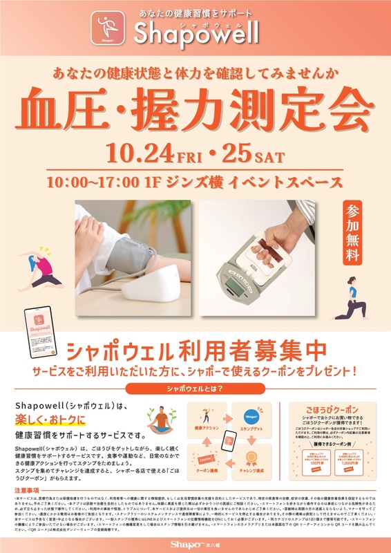 トピックス 【シャポウェル】血圧・握力測定会! 開催日時 10/24(金)・25(土) 10:00~17:00 場所 1F JINS横イベントスペース tweetする Facebookでシェアする LINEで送る