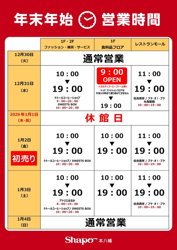 2025年12月31(水)から2026年1月3日(土)は、営業時間が変更となります。
