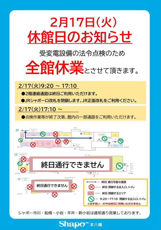 【シャポー本八幡】は全館休館とさせていただきます。