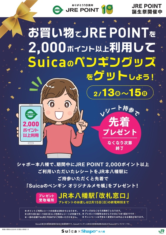 シャポー本八幡で下記の期間中にJRE POINT 2,000ポイント以上ご利用いただいたレシートをJR本八幡駅にご持参いただくと、先着で「Suicaのペンギン オリジナルメモ帳」をプレゼントいたします✨