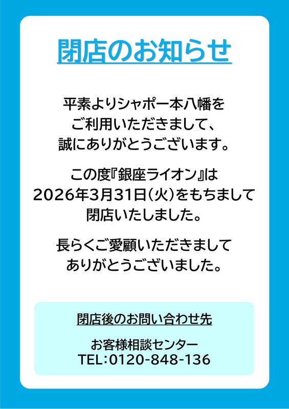 『銀座ライオン』閉店のお知らせ|トピックス|シャポー本八幡 | JR総武線本八幡駅直結のショッピングセンター