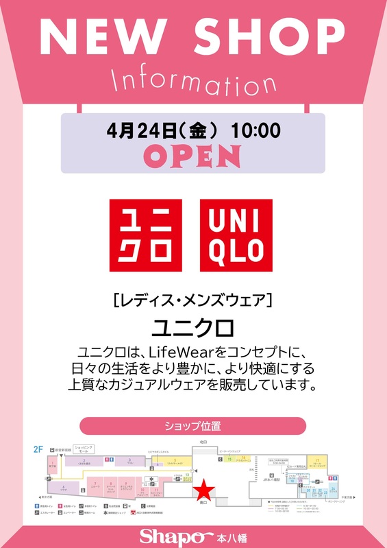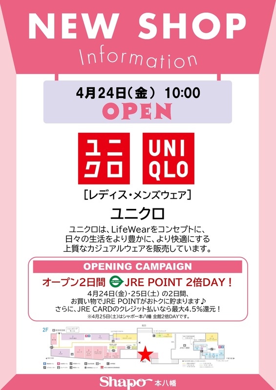 トピックス 『ユニクロ』がオープン! レディス・メンズウェアの『ユニクロ』が4月24日(金)シャポー本八幡にオープン!ぜひご利用ください♪ 開催日時 4/24(金) OPEN! 場所 ショッピングモール2階 tweetする Facebookでシェアする LINEで送る
