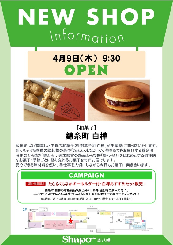 トピックス 『錦糸町 白樺』がオープン! 和菓子の『錦糸町 白樺』が4月9日(金)シャポー本八幡にオープン!ぜひご利用ください♪ 開催日時 4/9(金) OPEN! 場所 ショッピングモール2階 tweetする Facebookでシェアする LINEで送る