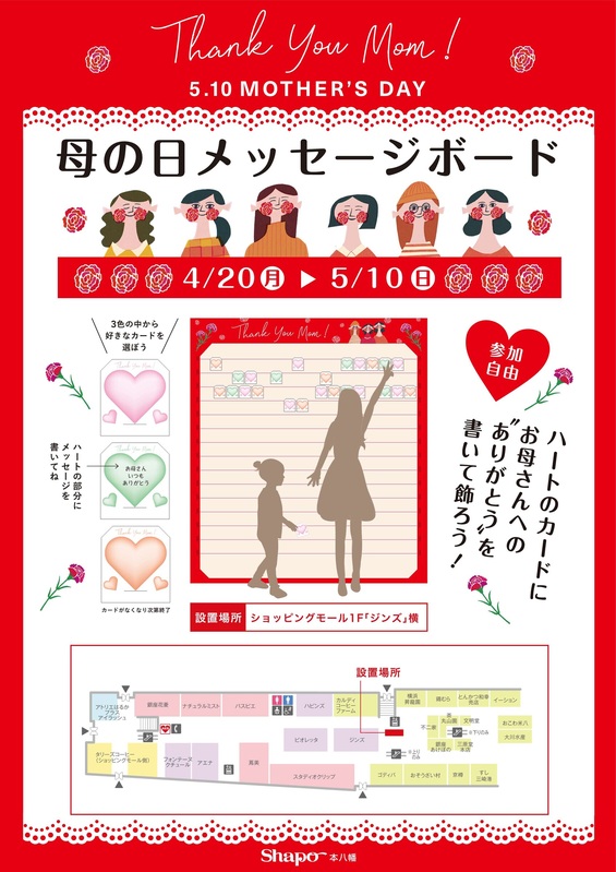 4/20(月)~5/10(日)の期間、ショッピングモール1F「ジンズ」横に『母の日メッセージボード』が設置されます!