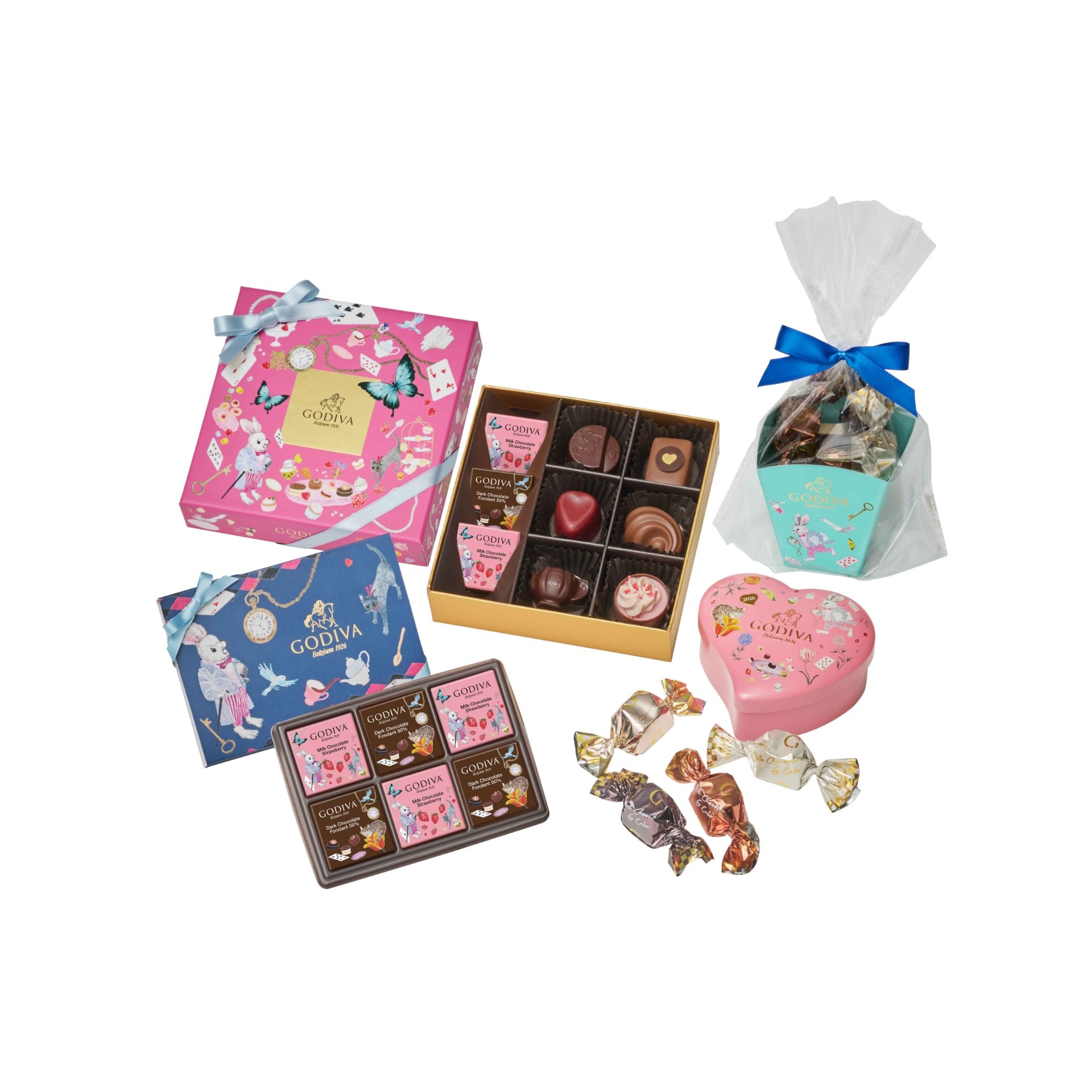 『不思議の国のアリス』の印象的なシーン『ティーパーティ』をイメージしたチョコレートを楽しめる、キュートなコレクションが登場! ティーパーティを彩るフルーツやケーキ、紅茶をイメージした限定チョコレートを、物語のシンボルであるトランプや白うさぎなどを描いた、大人かわいいデザインのパッケージに詰め合わせました。 バレンタインギフトにもおすすめです♪