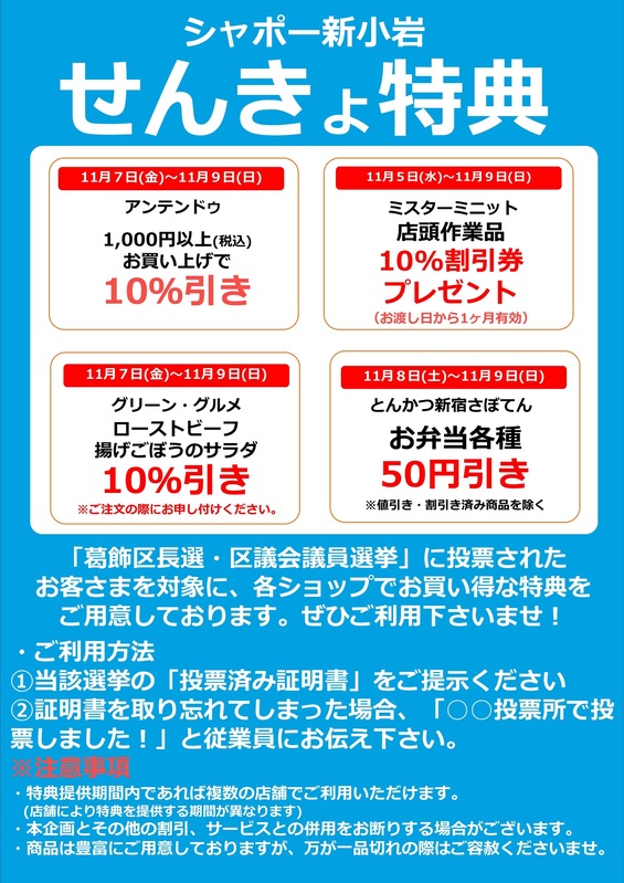 「葛飾区長選・区議会議員選挙」に投票されたお客さまを対象に、各ショップでお買い得な特典を