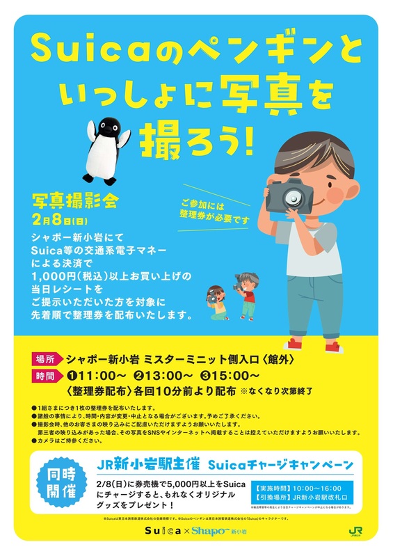 トピックス Suicaのペンギンといっしょに写真を撮ろう! ※ご参加には整理券が必要です 開催日時 2/8(日) 場所 シャポー新小岩 ミスターミニット側入口〈館外〉 tweetする Facebookでシェアする LINEで送る